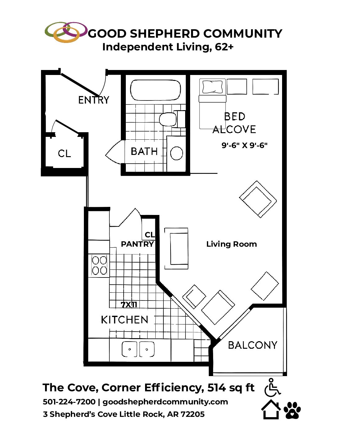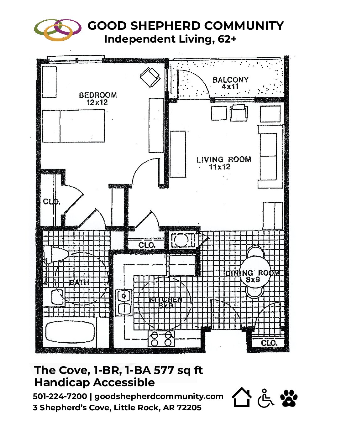 - 1 Bedroom with handicap accessibility (577 sq. ft.) $2,362 per month